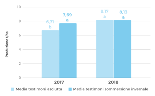 Per una migliore valutazione degli effetti agronomici della tecnica, in Figura 2 sono riportati i risultati delle parcelle non fertilizzate ottenuti nel 2017. Dal grafico si evince un effetto positivo della sommersione invernale sulle produzioni di risone, ma solo per il 2017.