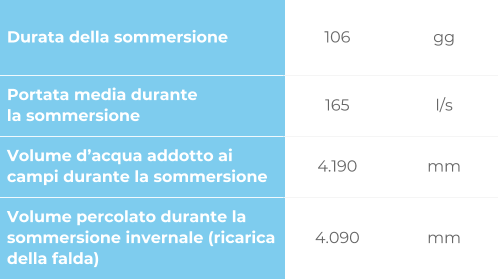In generale, come prima considerazione per le tre aree pilota, è possibile affermare che durante la sommersione invernale nei nostri climi quasi tutta l’acqua somministrata raggiunge la falda (circa il 97%).