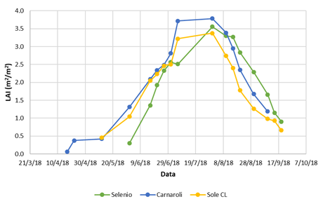 Fig. 15 — Esempio di curve di LAI ottenute, per l’annata agraria 2018, per tre varietà di riso da dati di telerilevamento