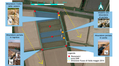 Misuratori di portata sono stati installati sui canali irrigui che alimentano e drenano le aree pilota, mentre pozzetti piezometrici sono stati posizionati all’interno e all’esterno delle aree sommerse durante l’inverno (Figure 3, 4 e 5).