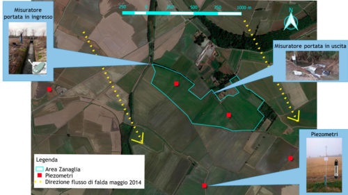 Fig. 3 — Posizionamento della strumentazione installata all’interno delle parcelle presso il CRR; le frecce gialle indicano la direzione principale di flusso nell’acquifero freatico